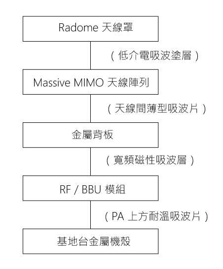 ※ 5G 基地台中用於抑制內部電磁幹擾和天線耦合的吸收體整合結構。