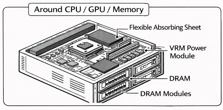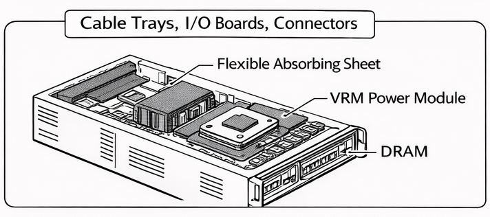 在高效能伺服器中,CPU、GPU 與記憶體模組周邊為主要電磁干擾熱點,尤其 VRM 電源模組與高速切換元件易產生強烈近場干擾。本研究於該區域之金屬遮罩或上蓋內側配置柔性吸波片(Flexible Absorbing Sheet),以吸收局部高頻電磁能量,降低近場耦合與反射效應。