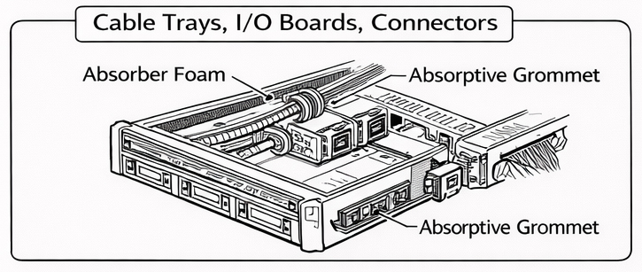 線纜托盤與高速訊號走線區為電磁波傳播的重要路徑,容易產生波導效應,使干擾沿線束傳遞。本研究於線纜托盤金屬內壁配置薄型吸波片(Shielded Tray Linings),以降低電磁波在托盤內的反射與傳播強度。