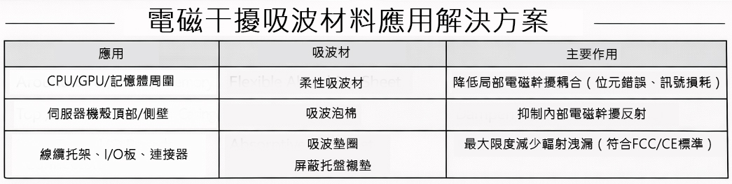 吸波材於伺服器系統中之實際配置位置與功能分區,依干擾來源與傳播路徑不同,將吸波材應用於關鍵熱點區、機殼腔體及電磁外洩路徑,以降低電磁干擾對高速運算與訊號傳輸之影響。
