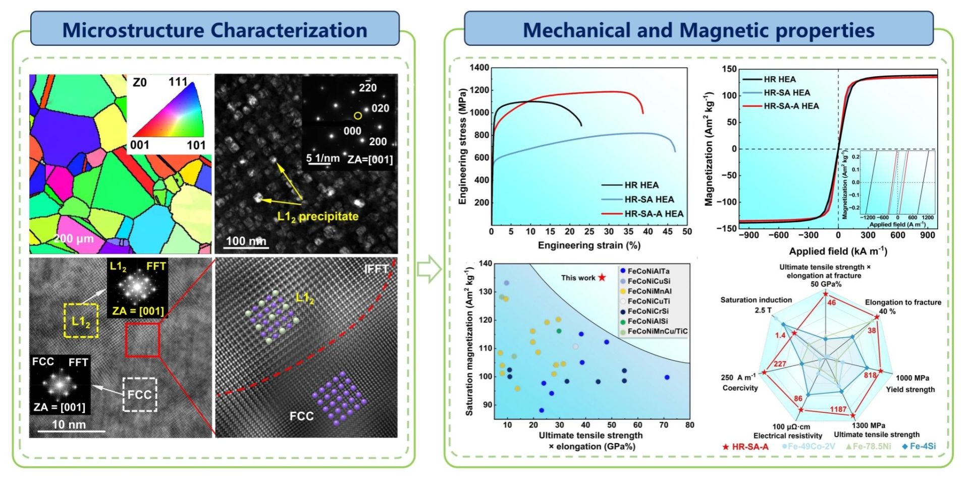團隊成功設計出新型Fe-Co-Ni-Al-Nb-B系高熵合金,微觀組織由無序的FCC基體和與基體共格的有序納米相構成,合金展現出優異的軟磁性能(135.28Am2kg-1,227.54Am-1)和拉伸力學性能(1187.5MPa,38.7%)組合,同時在居裡溫度以下展現出超高的穩定性,綜合性能遠優於傳統軟磁材料以及已報導的軟磁高熵合金,為新一代結構功能一體化高強韌軟磁材料的設計和發展提供了新的思路。